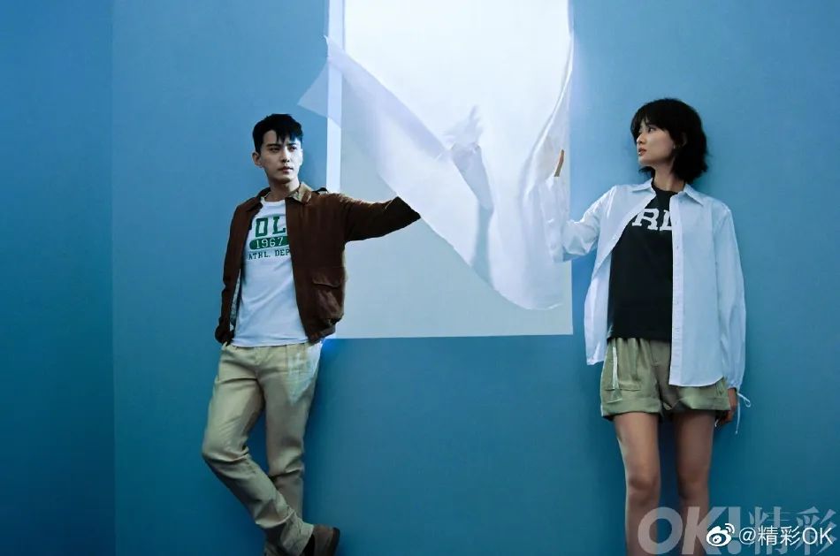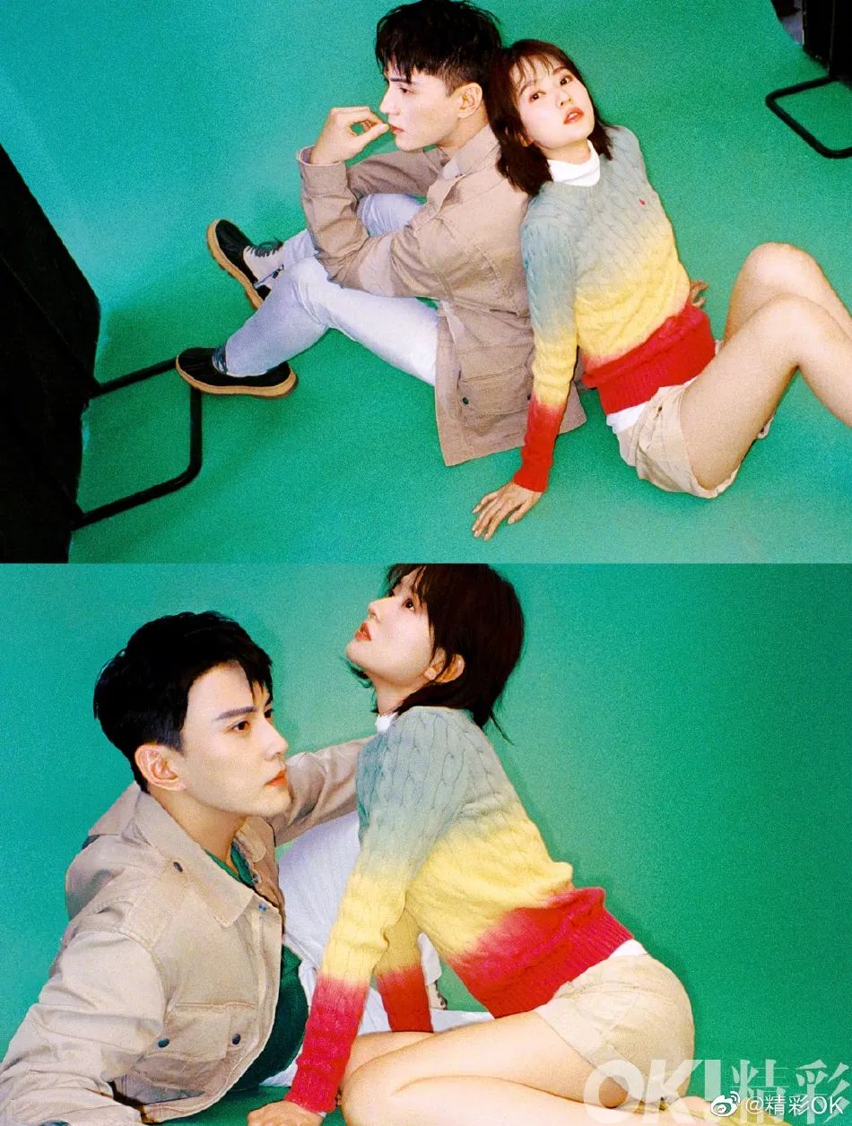 乔欣穿着一袭三色上衣,搭配黄色短裤,露出自己白嫩的大美腿,徐正溪则穿着棕色外套,搭配绿色衬衫和白色裤子,两人时而背靠背坐地,时而女方跪在男方跟前,俊男美女还是很有CP感的。