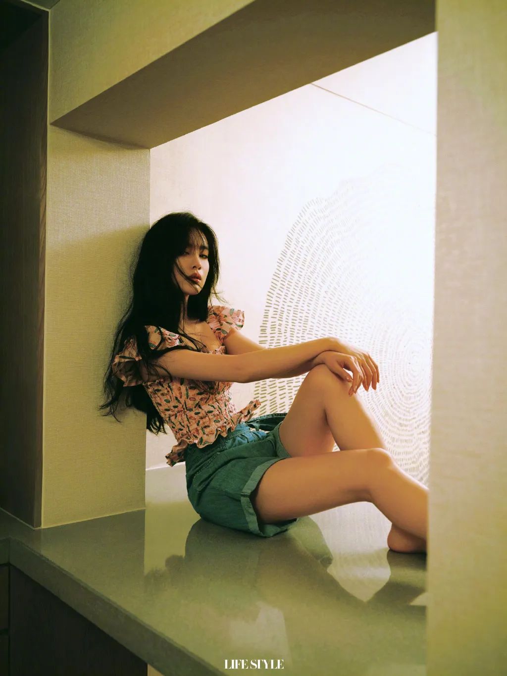 孟子义穿着粉色印花上衣,搭配牛仔短裤,她坐在窗户边,表情妩媚,烈焰红唇,乌黑的长发飘逸,大秀白皙的大美腿,绝对性感撩人。