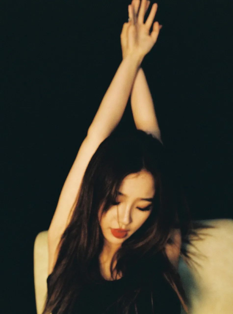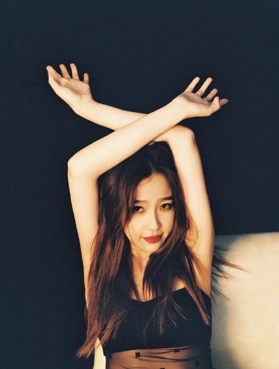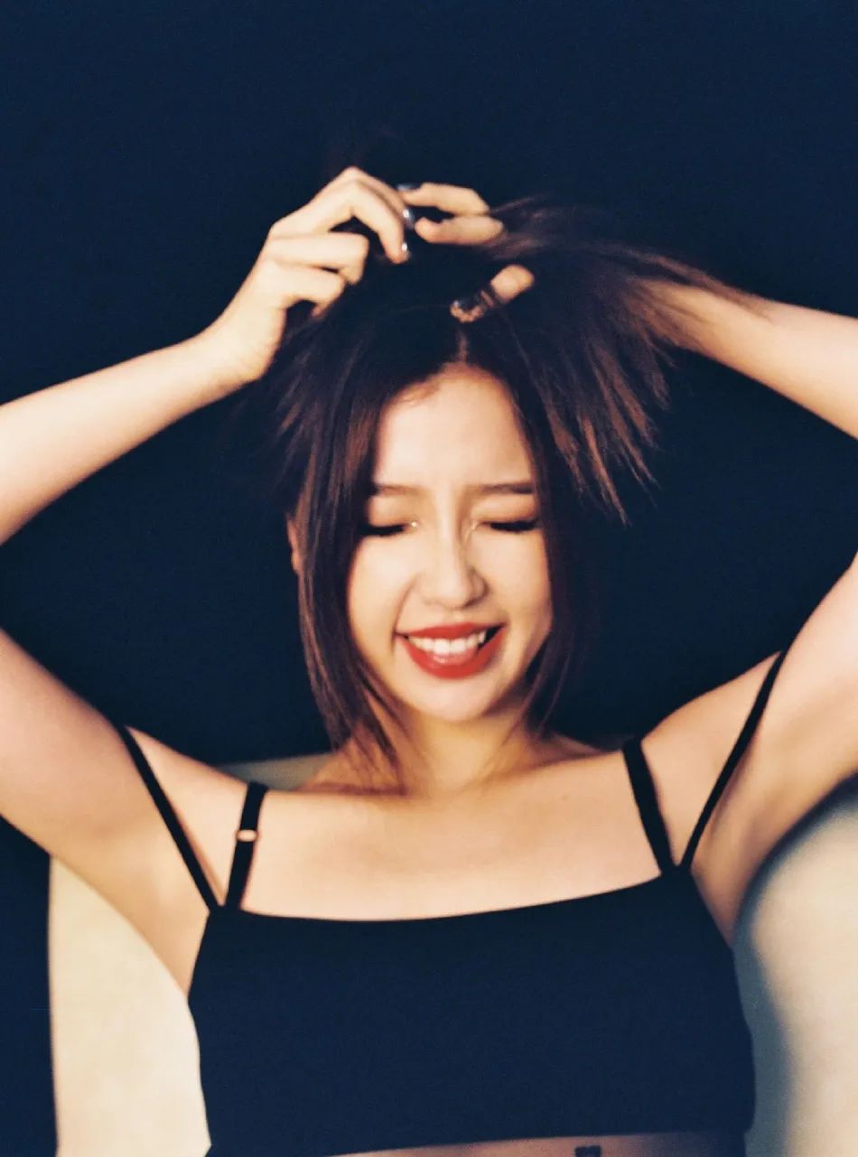虞书欣身穿黑色吊带上衣,她俏脸清丽脱俗,五官精致,闭着双眼微笑卖萌,双手抚弄着自己的长发,肌肤白皙如雪,微微一笑很倾城!