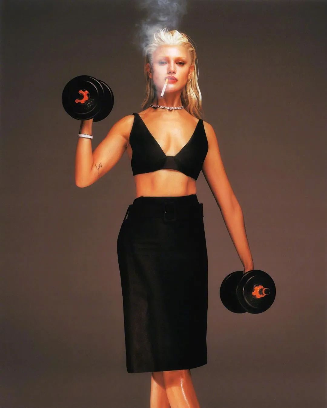 艾莎·冈萨雷斯身穿黑色胸罩,搭配黑色长裙,她俏脸成熟妩媚,金发碧眼,烈焰红唇,吊着烟卷的样子很叛逆,双手举着哑铃,大秀自己健美火辣的身材,更是性感火辣!