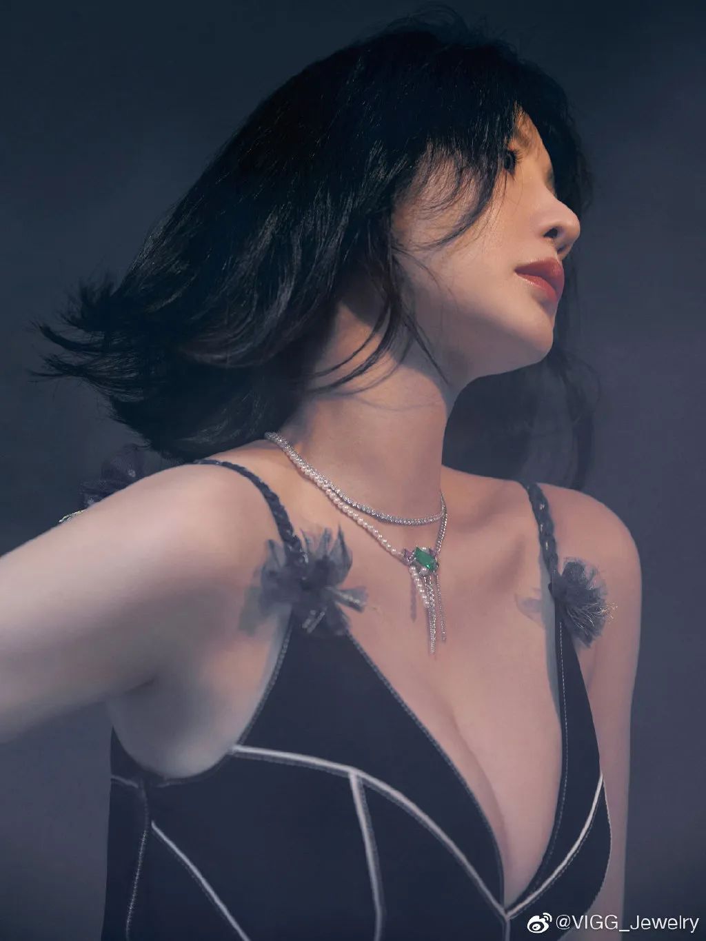 柳岩身穿深蓝色吊带连衣裙,脖戴名贵项链,她俏脸成熟妩媚,秀眸若有所思,烈焰红唇很撩人,乌黑的秀发飘逸,大秀自己傲人的事业线,绝对性感火辣。