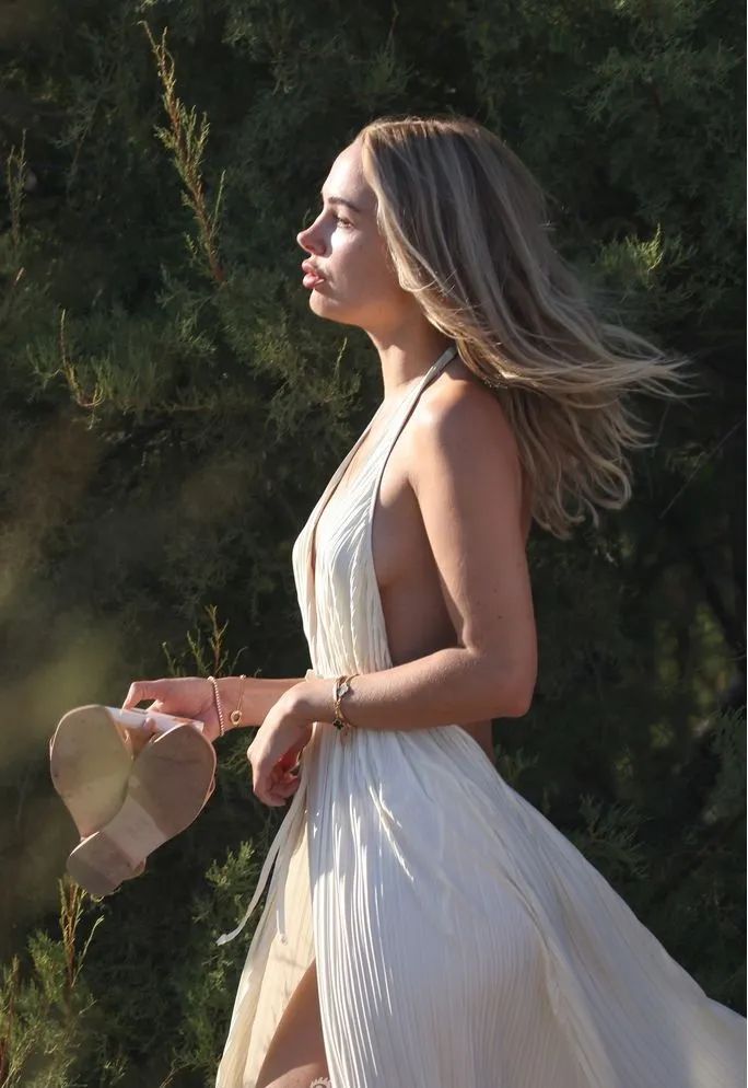 金伯利·加纳身穿一袭裸背沙滩裙,她俏脸清丽,秀眸明亮,金色长发飘逸,大长腿修长,她单手提着自己的鞋子,大秀曼妙的身材曲线,肌肤娇嫩,绝对性感撩人。