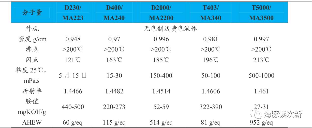 聚醚胺是一种性能优良的环氧树脂固化剂,是高性能复合材料的关键原材料。具有低粘度、高强度、高韧性、易加工等特殊性能。分子量从 230 到 5000 的一系列产品具体产品分为 3 官能度的 T 系列及 2 官能度的 D 系列和 E 系列。
