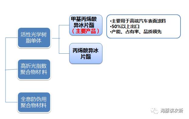 公司光学级聚合物材料方面,产品主要为丙烯酸异冰片酯和甲基丙烯酸异冰片酯,设计年产能2,500吨。主要应用于光固化涂料、汽车漆等领域,公司新开发的光学树脂产品甚至可适用于性能要求高的航空航天功能性材料,目前主要面向境内销售。
