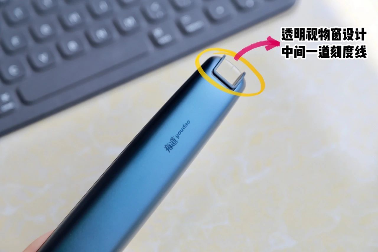 词典笔下方的扫描端是一个支持OCR的识别模块,采用了透明视物窗的设计,兼顾了美观与易用性,扫描框中间有条竖直的标识线,方便更快速精准对准单词和句子进行扫描,大幅提升学习效率。