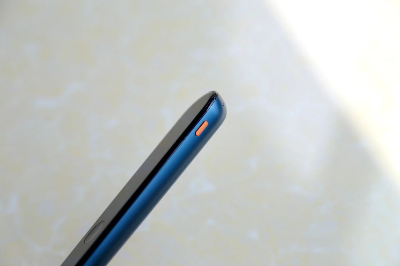 侧面的开关精致小巧,橘色和深湖蓝背壳的撞色很好看。