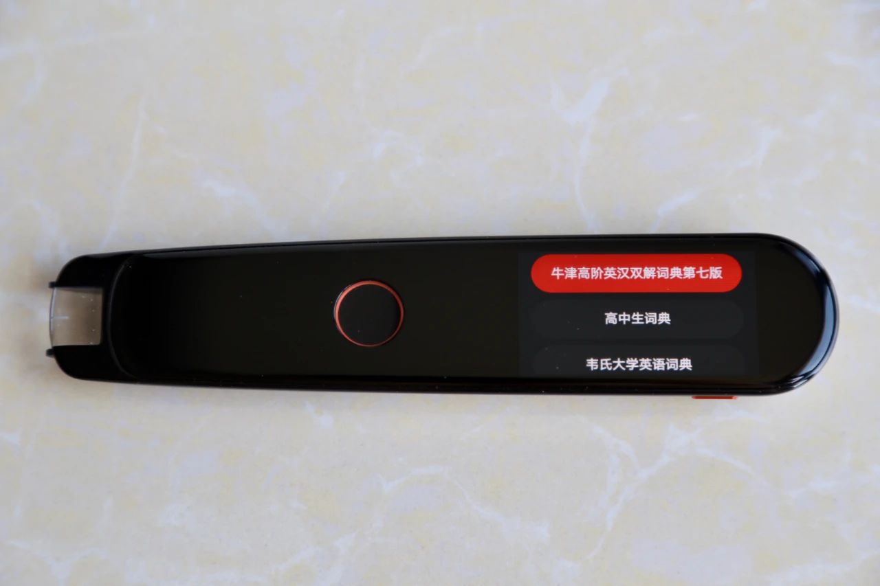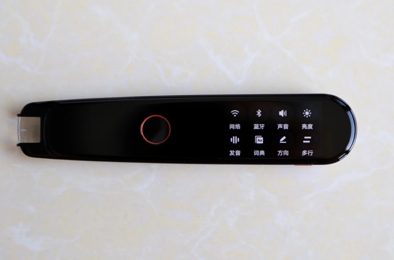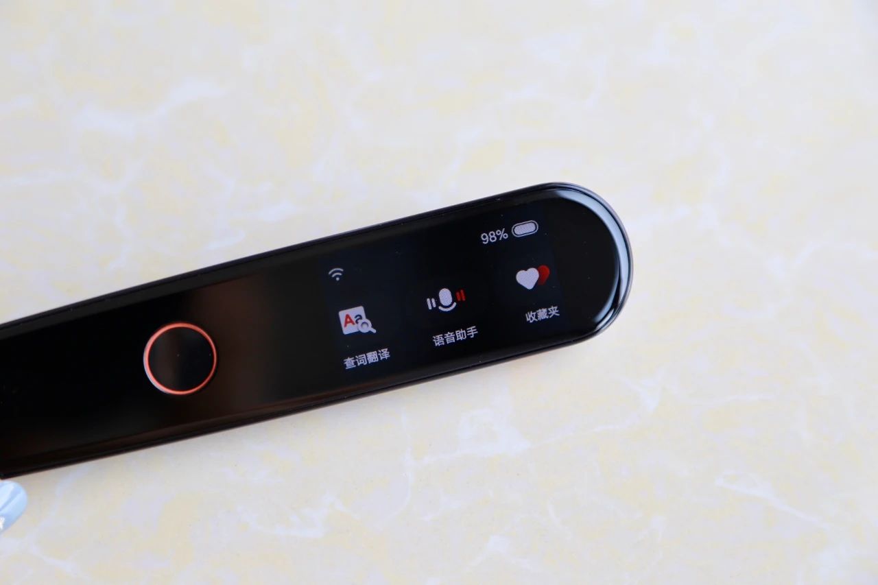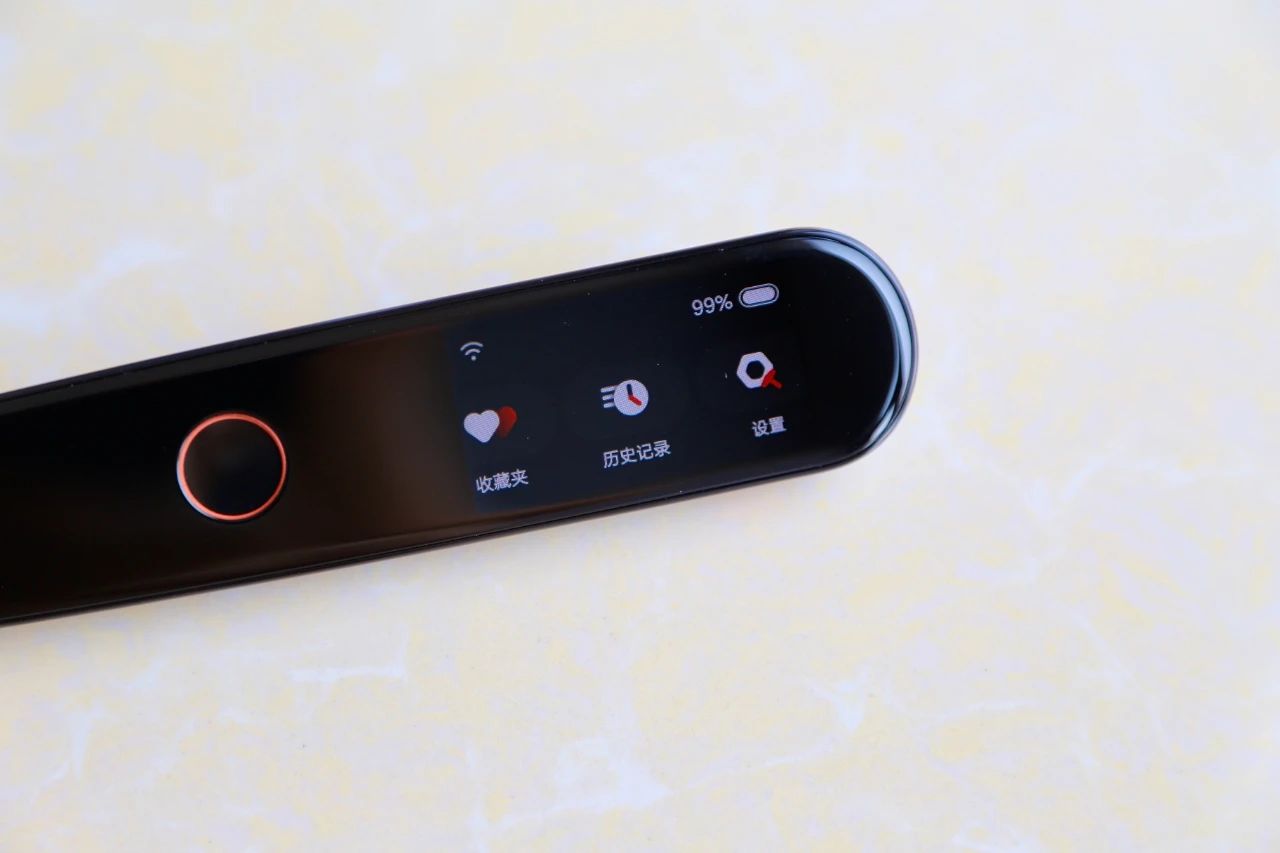 词典笔机身正面有一层印字的透明磨砂薄膜,让人第一次使用就能快速直观的了解这款产品。