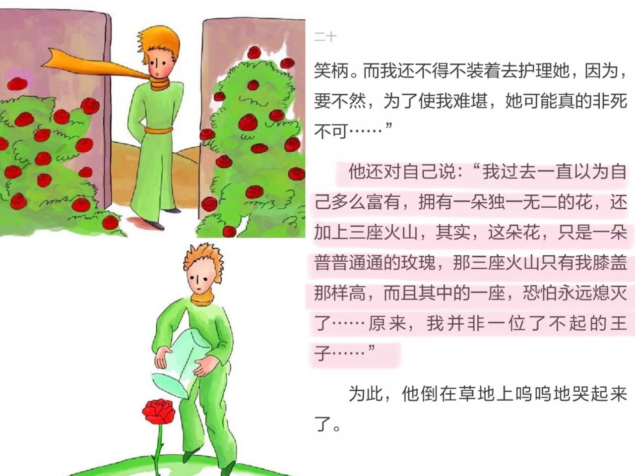 电子书中文版:他还对自己说:”我过去一直以为自己多么富有,拥有一朵独一无二的花,还加上三座火山,其实,这朵花,只是一朵普普通通的玫瑰,那三座火山只有我膝盖那样高,而且其中的一座,恐怕永远熄灭了……原来,我并非以为了不起的王子……“。为此,他倒在草地上呜呜地哭起来了。