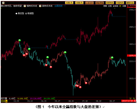 图1所示为今年的大盘运行状态。至10月24日收盘为止,指数位于2164点,与年初1月4日的开盘点位2289点相比,下跌125点,跌幅为5.46%!而若按大盘的操盘策略操作,可以看到,通过及时清仓避免下跌风险,全赢指数到10月24日时已经位于2700点附近,同样与年初1月4日的开盘点位2289点相比,上涨了411点,涨幅达17.95%!那么一正一负,不难看出,全赢指数已经跑赢大盘超过20%!