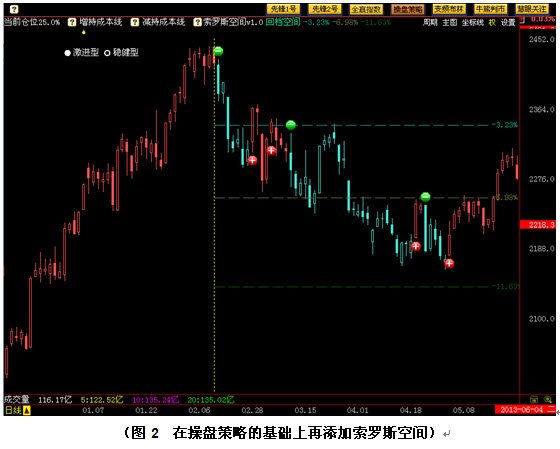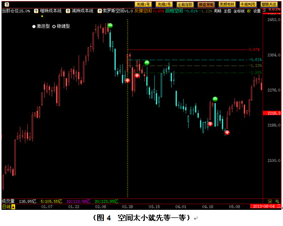 由此可见,索罗斯空间不仅为我们指出了反弹或下跌的基本目标位,同时也指明了趋势反转的水分岭。有了索罗斯空间,操盘策略就如同插上了翅膀,开减仓信号从此不再是千篇一律的加减号,而变得彼此有所区别。投资者依据空间的大小,可以在开减仓时对自己的操作做出更加精准的判断,从而更好的把握市场中的每波行情。