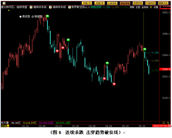 如图6所示,在 6月3日时,索罗斯空间为我们指出:如果大盘出现回落,正常回调的幅度为0.28%,深度回调的幅度为1.63%,若跌幅超过3.30%,则趋势破位。那么在6月4日大盘出现清仓信号的时候,可能有一些投资者会认为回调空间不大而没有减仓。但是随着大盘的连续下跌,我们由图6中看到,在6月7日时,大盘已经击穿了最后的趋势破位线,说明上升趋势已经终结,此时必须撤离。若投资者此时离场,大盘点位尚在2200点之上,但若投资者依然心存侥幸,继续固守,等来就是大盘的猛烈下杀。仅仅不到10个交易日,大盘就已经跌到2000点下方,最低时甚至见到了1849点。