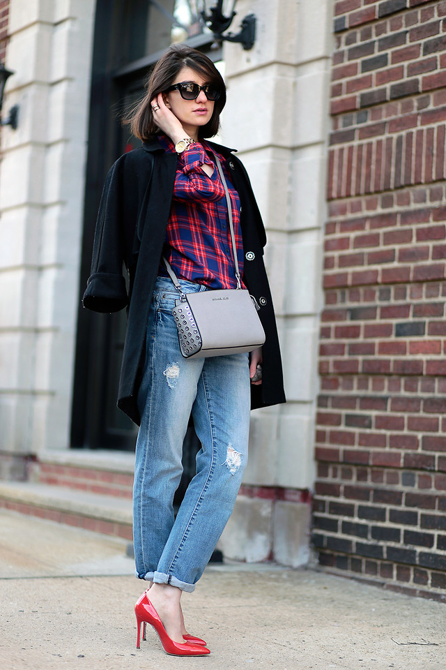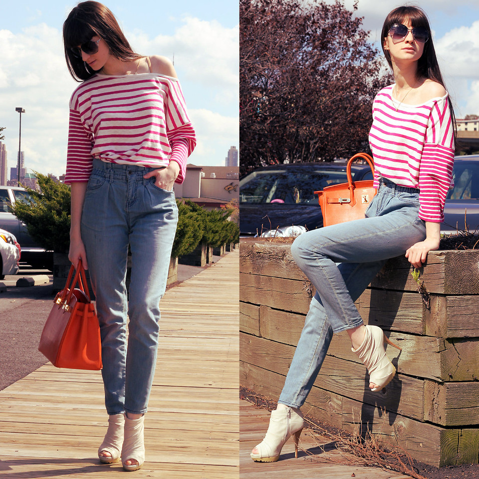 红条纹与锥形牛仔裤的搭配非常复古。也搭配除了女人味的曲线哦~
