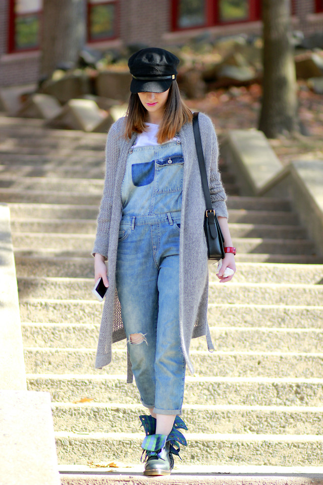 相反,同一双短靴,搭配俏皮的背带裤却流露出了清纯可爱的活泼感。