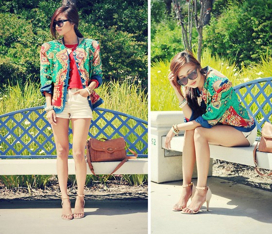 花色的内搭是搭配的亮点,但是亲们却不能忽略了短裙提高了高度,高腰线显得腿格外修长身高自己也显高啦。另外腿细,ankle绑带凉鞋一样穿哦,所以三月不减肥……你们都懂的。