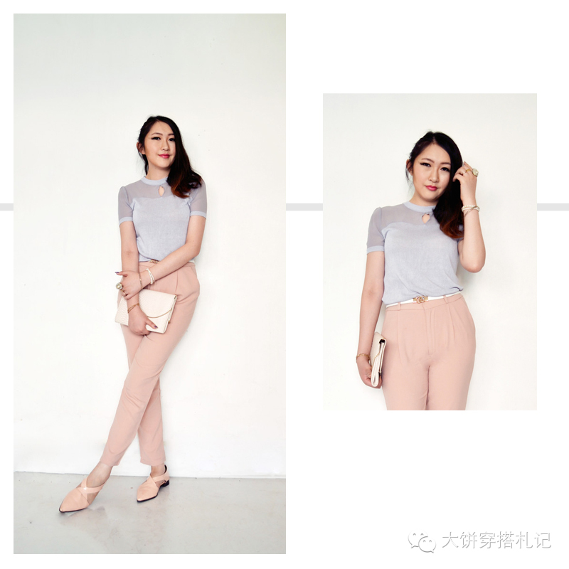 温柔无害的形象对行政类工作的姑娘来说,至关重要。要能上通领导,四面吃开那么无害感能帮助你获取他人的信任。粉红和灰色是好搭档,两个完全无害的色彩,碰在一起有制造甜美形象的作用,当然啦,增加一些职业感就用裤装吧,其实包臀裙也可以~大饼搭配了尖头粉红色的单鞋,这样与裤子有延伸感,能够显高。