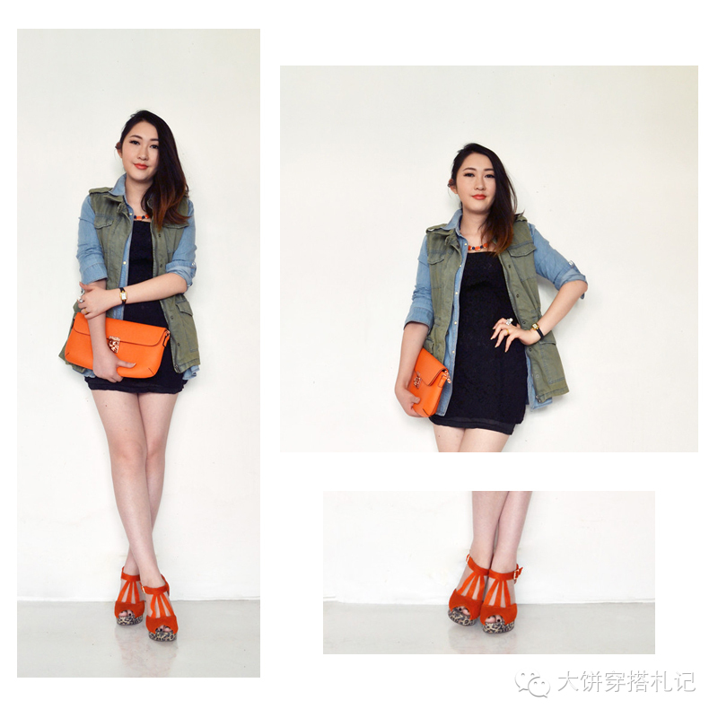 小黑裙打底,用衬衣和军绿马甲做叠穿,叠搭能够给人层次感和立体感,因为小黑裙的长度已经是最显腿长的短边啦,所以可以不用高腰线啦,高腰线虽重要,但也不是必须有,之前大饼写显高显瘦辑的时候就说过,几个法则用一个就可以,同时用效果最佳。