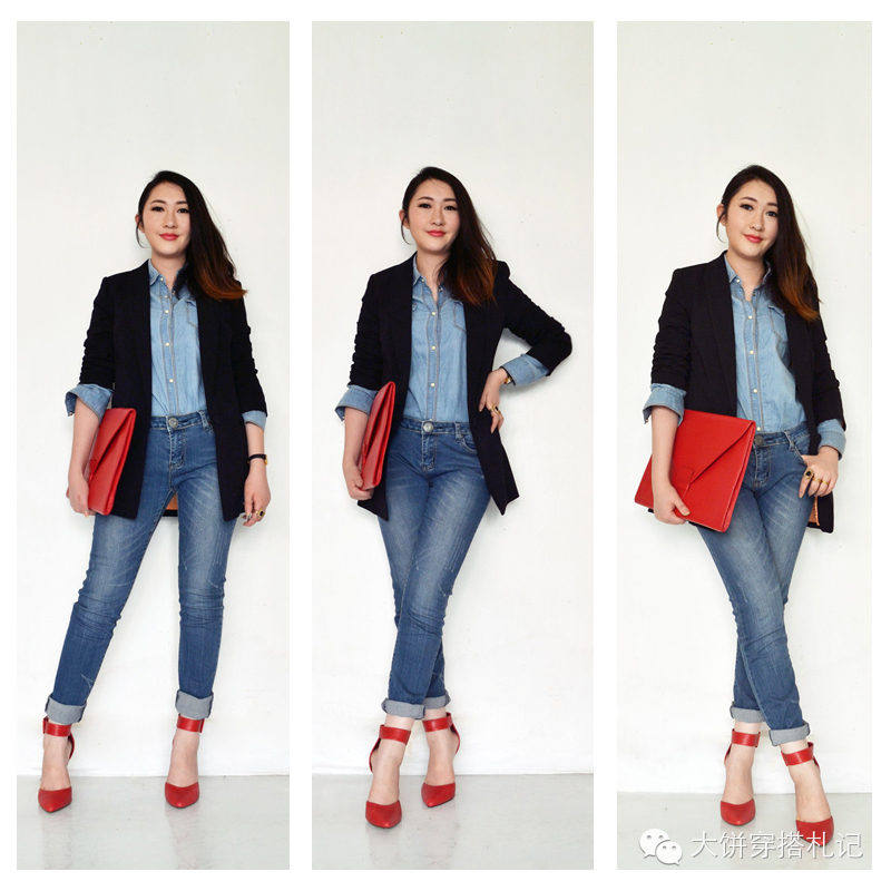不知道的人一定得想某饼到底有多么的日理万机到底有多少商务谈判要搞定,TT~其实这身搭配就是秋日里普通上班的装扮也很ok啊~作为三件基础单品:小西装、牛仔衬衫、牛仔裤组成的搭配,鞋包随你啦~最简单的不出错搭配依然是大饼写过的鞋&包好couple。