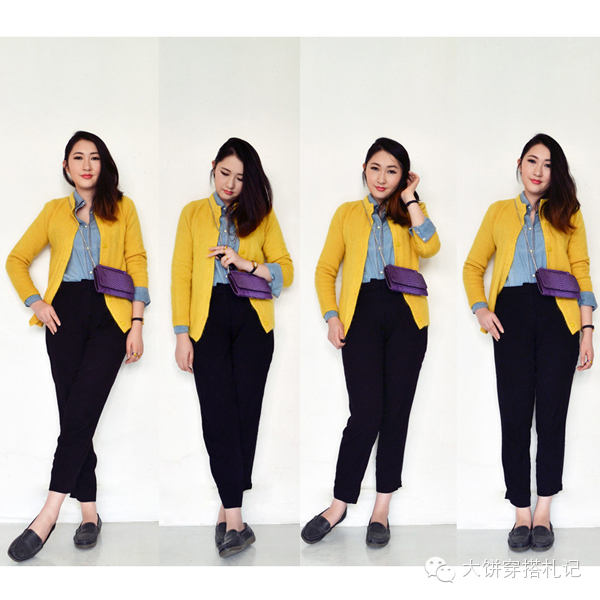 周天一定要舒舒服服滴,所以跟高跟say bye。一双老太太的一脚蹬,真皮的太舒服了,穿着爬山都是爱。姜黄的针织开衫满满都是柔和的温暖,秋风瑟瑟,温暖感的配色+同属性单品太适合家居和约会啦。紫色小包做点缀再大一点就更喜欢啦,