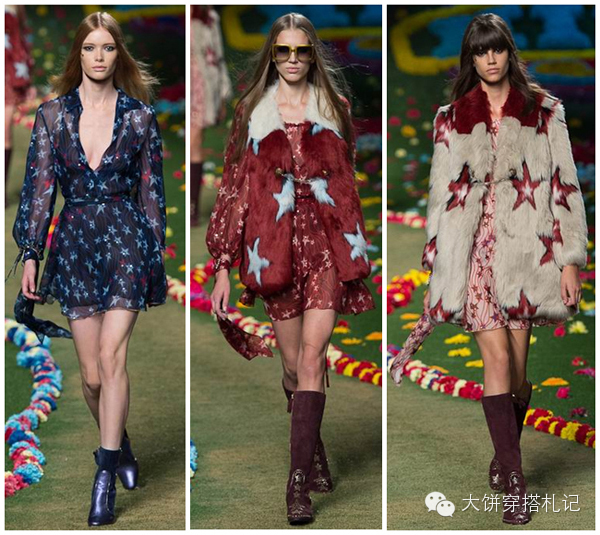 星星元素贯穿了TOMMY HILFIGER的整个秀场,从印花的星星连衣裙、毛衣到星星皮草,再到细节里的星星项链、星星短靴,还有麻豆们身上的星星纹身……饼姑娘只能说这就是天际星星大聚会,无处不星星。