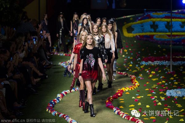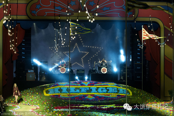 保持发挥自己对自由与生命的追求,Tommy从年轻时乐队得来灵感的摇滚风格“满天星”作为本季的主打元素。牛仔拼接、条纹、金属、喇叭裤、皮质短裙……还有闪烁的繁星,TOMMY搬来了一场摇滚的音乐嘉年华,繁花铺就的音乐盛宴会场,架子鼓律动声响,叛逆又崇尚自我的年轻姑娘们正在赶场绿草地上的音乐会。