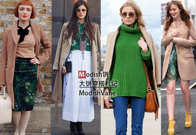 具有异国情调的配色,驼色和墨绿共有的沉稳、大方的气质相得益彰,可以渗透出自然感的风韵。这一组配色完全来自大自然,不正好是一颗树的组合么?所以搭配起来要注意比例适当,以免自己也变成“树苗”哦~采用绿色的印花就是聪明的做法~