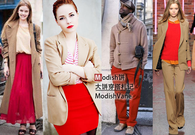 同理偏红的夺目橘红完全可以更好的替代大红,有了温柔驼色的包裹,你会发现橘色的光芒有所收敛,但依然引人瞩目。