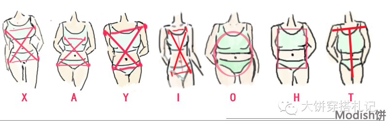 每个人对自己的身材都会有一定的了解,但不见得每个人都了解自己的优点却肯定会知道自己的缺点,例如肩宽、腿粗屁股大……根据这些优缺点。大饼把身材分类分为(用字母哈)X,A,Y,H,O,I,T,总共7种身型~每种身型具体分析: