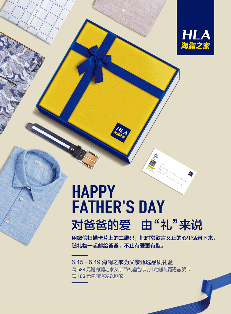 指定店铺购物满588元,可获赠海澜之家父亲节专属礼盒,礼盒里可以定制专属的语音贺卡哦,平时对老爸说不出的心里话,录下来让海澜之家帮你传达!(礼盒限量一万个)