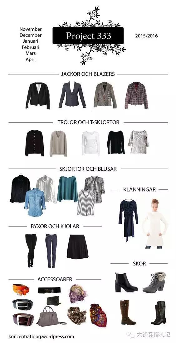 所谓的Project 333,不过是要在三个月里只穿戴33件单品,并且满足工作、娱乐、生活的需要,而这33件里要包括衣物 外套 配饰 珠宝 鞋子,不包括在内的是婚戒、运动服、家居服和内衣。