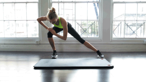 动作五:上半身微侧向前,延展腿部,可以伸展大腿内外侧、臀部,记住不要太快,单边停留5-10秒,两边分别做5次。