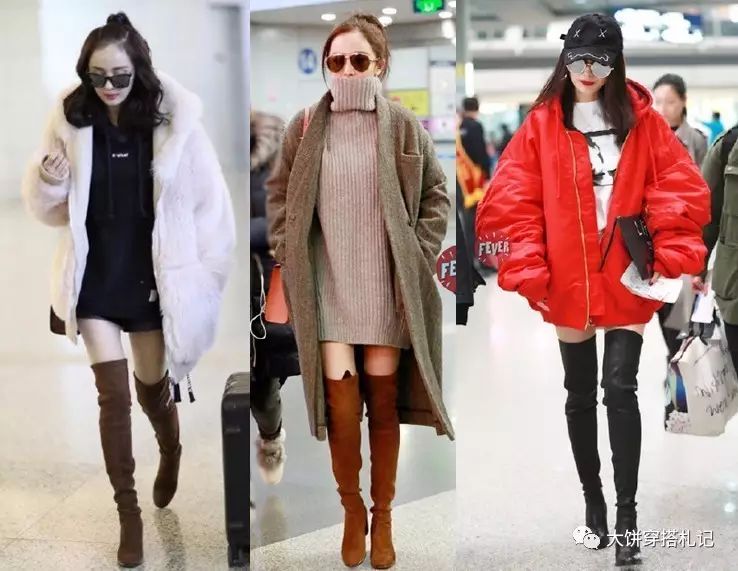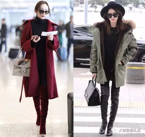 至于大幂幂自己最爱的,大腿根结束的长上衣/裙装搭配大外套,穿上过膝靴也能显瘦~