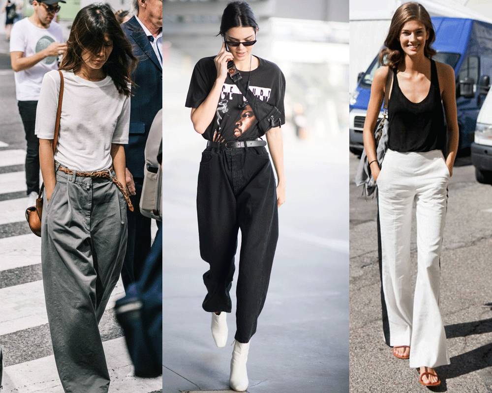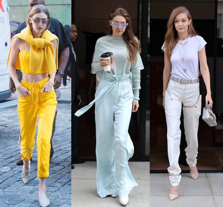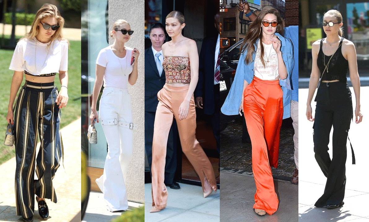 而这种质感的单品还譬如各种宽裤腿。GIGI Hadid整个六七月都在用非常简单并且清凉的上衣单品,搭配这种大气场的裤装~这也是她一直以来的菜了!