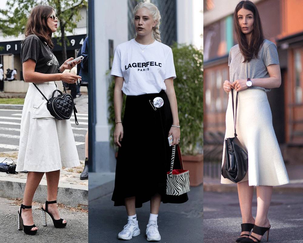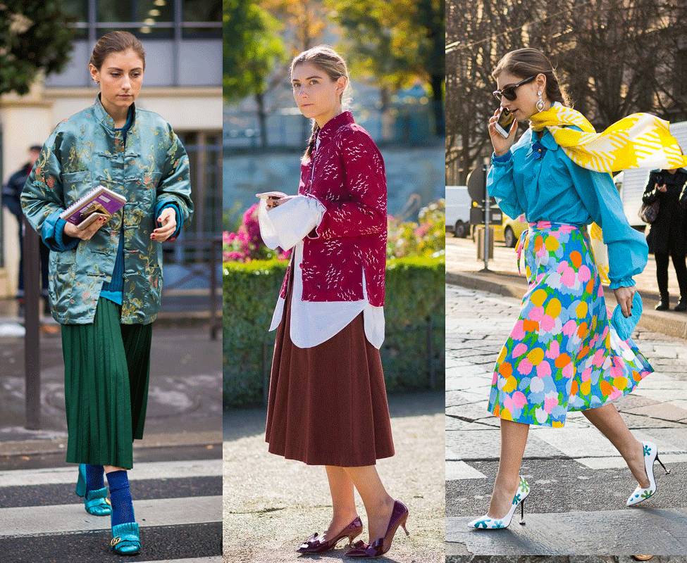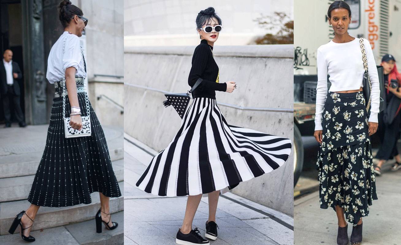 这种质感怎么说呢?就是用料够足的做了个大圆摆,再配以一定高级的配色or图案,就能够单穿T恤都很好看。而图案里,大面积的印花和波点,虽然能够增加细节感,但驾驭起来有风格限制微挑人;但各种直条纹就不一样了,现代感摩登了不少,好驾驭又醒目,于是在街拍里特别吃香!