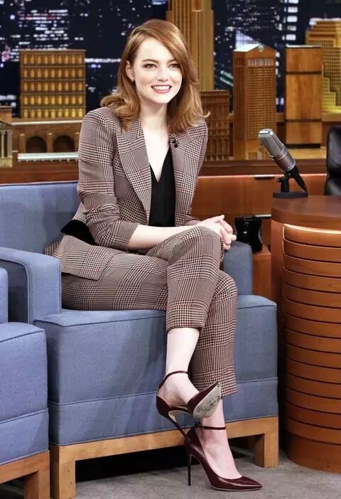 石头姐参加肥伦秀时也穿过一身驼色和红色的格纹西装,加上一双枣红色的高跟鞋,整个人看起来暖暖的,还特别有品。