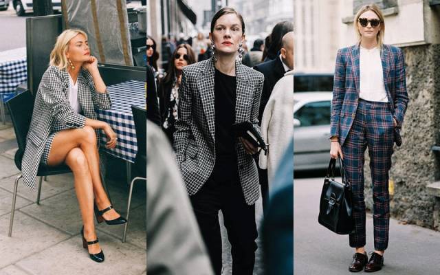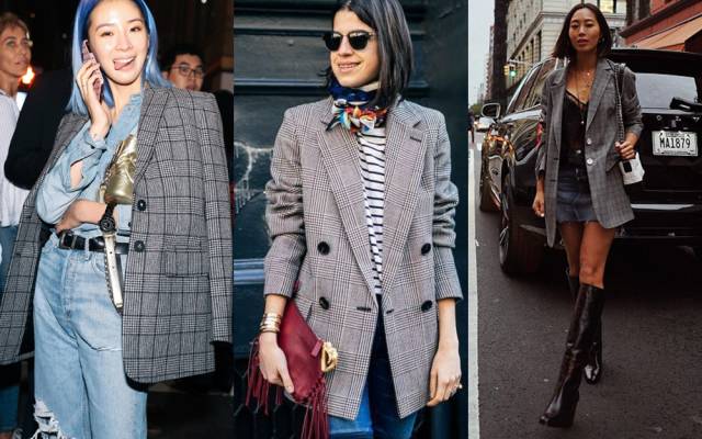 威尔士亲王格纹西装首推的是灰色款,看起来干练优雅,内搭格纹衫或亮色T恤都ok。这是Irene Kim、Leandra Medine和Aimee Song的近期最爱,她们都在变着花样穿。