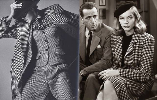 最经典的千鸟格是黑白色,经常被用来做西装。例如Ralph Lauren最新的2017秋冬系列里整套的千鸟格,还有《夜长梦多》里Lauren Bacall那身富家女套装,知性优雅简直是男女通杀。