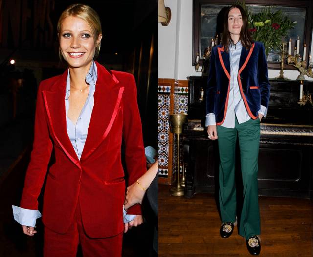 最近还流行一种有翻领滚边设计的丝绒西装,从前大美人格温妮丝穿过,没想到今年因为90年代风格的回潮这件单品又开始流行起来了。