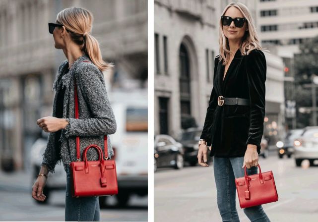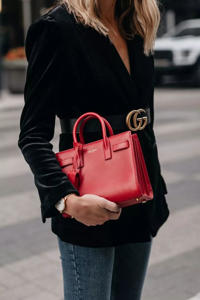 红色的baby SAC DE JOUR比黑色看上去更Q。拎起来很Lady,单肩背更潇洒。像Amy这样,搭配小香风外套、丝绒西装,满满的秋冬气息。