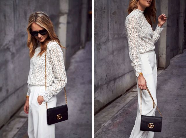 或者像Amy这样,白色蕾丝上衣搭配白色阔腿裤,all white look加黑金配的包,就不会显得太单调。