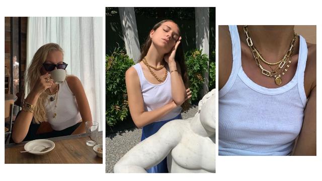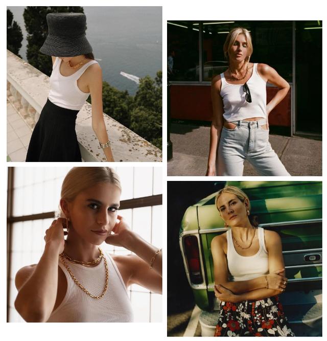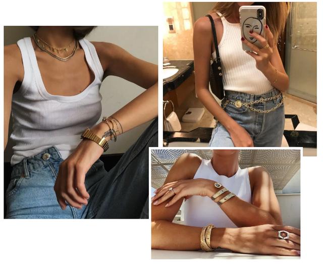 老头背心无论怎么搭,总归是一件休闲度极强的单品。如果不想看着太邋遢,一定!一定!要用上各种精致的首饰!