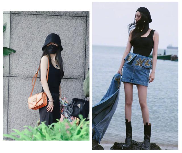 对,不是吊带,是那种男人爱穿的无袖背心!大幂幂最近连着穿了两款黑色背心,分别搭配了阔腿裤和短裙: