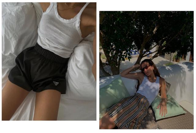 不止是长裤,用背心搭运动短裤的也不少。Alyssa和德国博主Marie von Behrens去沙滩的时候都pick了颜色比较鲜艳的运动短裤: