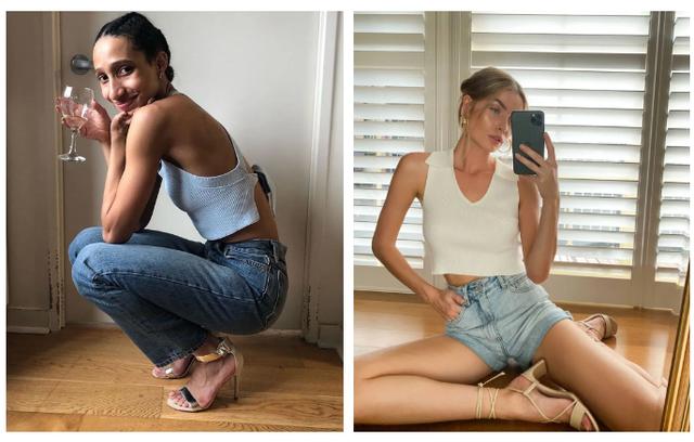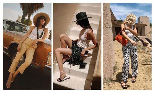 如果想要稍微精致一点,可以像Lauren Caruso和Camille Charriere这样换双高跟鞋。她俩穿的分别是尖头短靴和现在很火的宽带凉拖,就比较女人味~