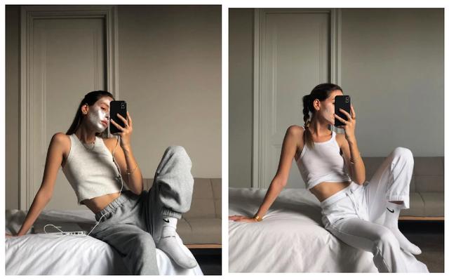 墨尔本博主Jessica Alizzi则是在做面膜的时候用背心和运动裤穿起了全身一码色,连面膜颜色都是顺色的!最后还不忘顺便露一露现在ins网红们都爱穿的耐克袜~