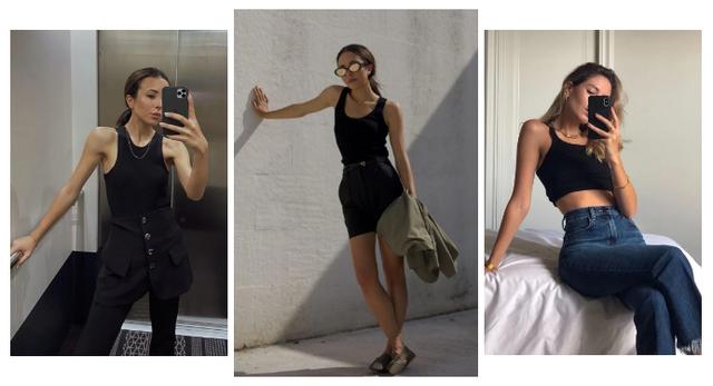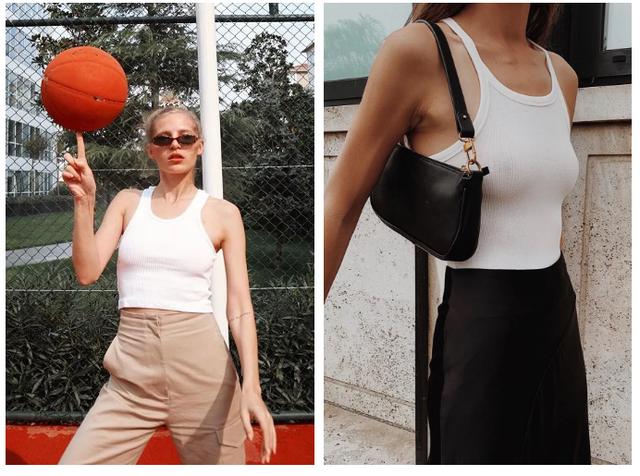 Tank背心中最经典的一定是白色了,但其实从搭配的角度考虑,也可以多试试别的颜色。基础一点呢,像黑色就不错,单穿或做内搭都很实用。