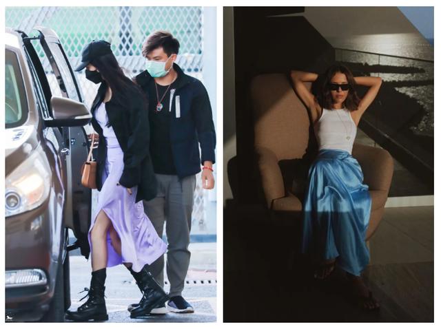 前不久大幂幂就用白色背心搭配过紫色缎面裙,好看极了!Débora Rosa则搭配了亮丽的宝蓝色,这种高明度的裙子搭配白色背心最容易出彩!