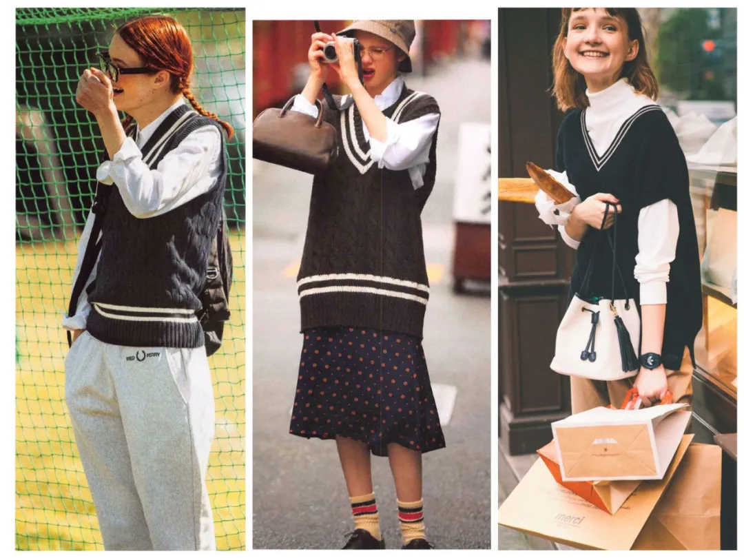 这个时期还流行针织套头马甲,是常青藤学院风的标配。