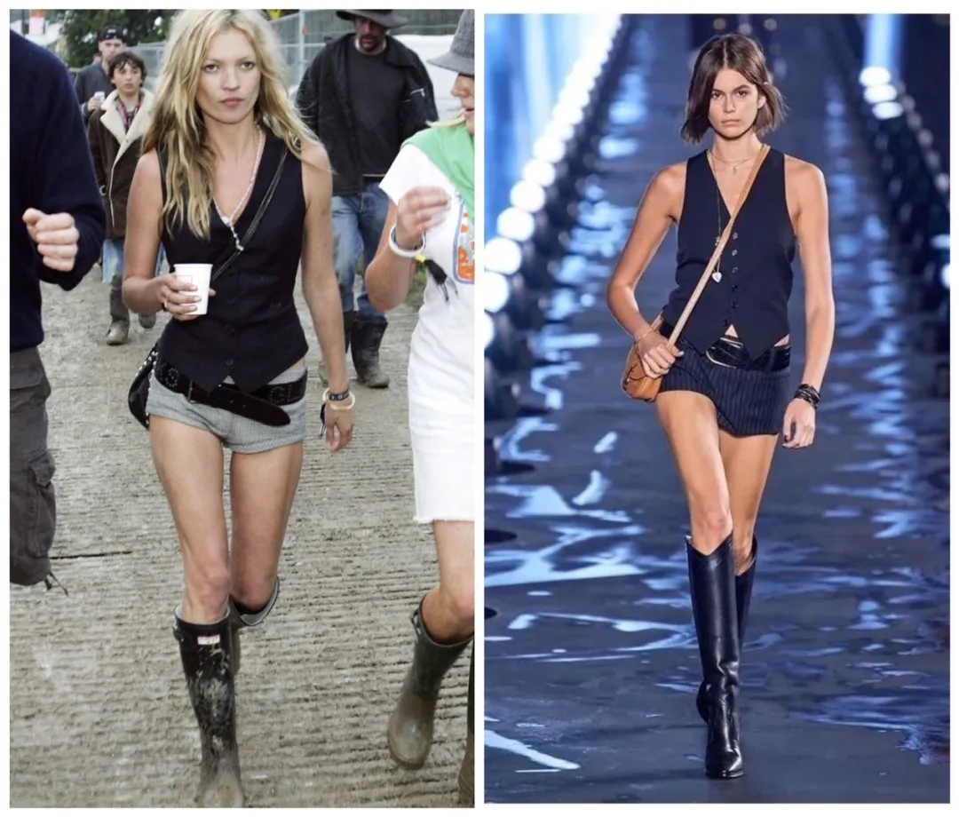 当年音乐节这身,可谓掀起一股不小的风潮!许多人争先模仿,T恤、马甲、超低腰裤、雨靴,自此成为经典的“凯特Look”。