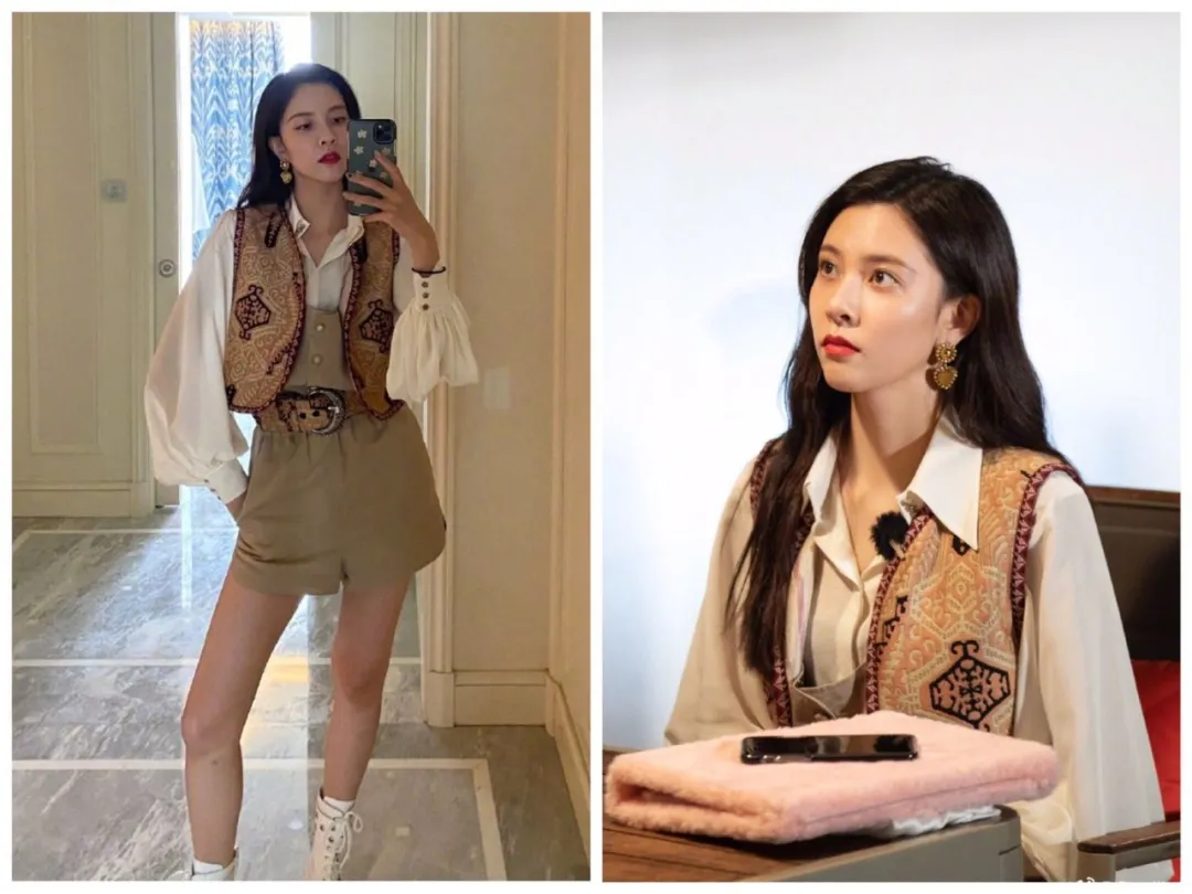 图腾刺绣马甲,搭配羊腿袖衬衫、卡其色短裤、民族风腰带,又浪漫又诗意~