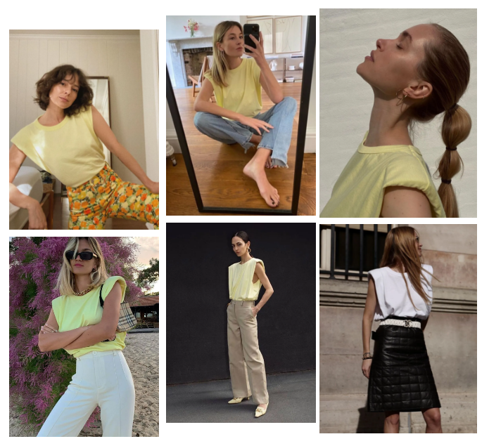 除了这两种最常见的,这两季还特别流行无袖T恤,尤其在纽约品牌Frankie出了垫肩无袖T之后,风靡整个时尚圈。